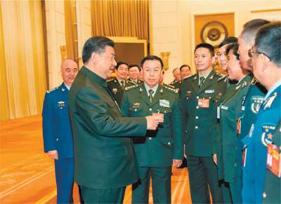 3月12日,中共中央总书记、国家主席、中央军委主席习近平出席十二届全国人大五次会议解放军代表团全体会议并发表重要讲话。这是会议结束时,习近平亲切接见来自基层部队的部分军队人大代表。新华社记者李刚 摄