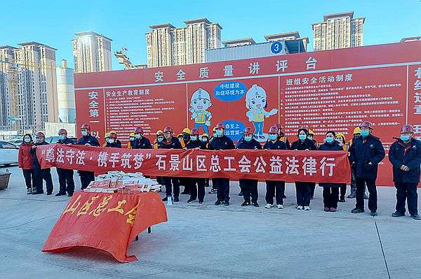 为进一步弘扬法治精神,不断提高广大员工的法律意识,营造遵纪守法的良好氛围,12月17日,集团公司承建的北京市十一学校石景山学校新建工程项目部邀请石景山区总工会相关领导及具体工作人员莅临工地现场,联合组织开展了以“遵法守法•携手筑梦”为主题的法律宣传活动。
